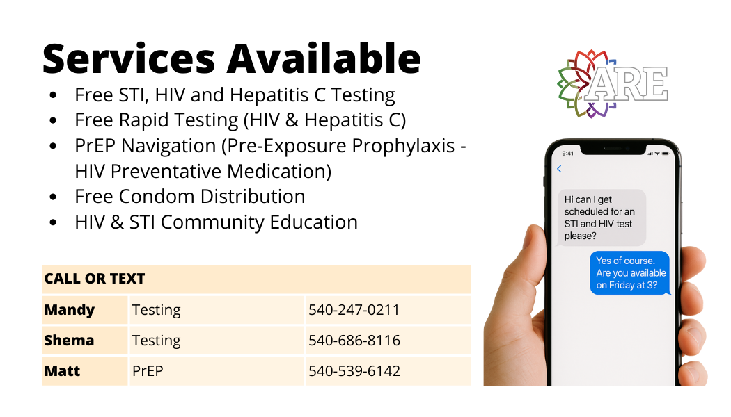 Sexual health is just as important as your physical and emotional health and wellness. ARE offers a variety of sexual health services, including free HIV and Hepatitis C testing on-site in a confidential, judgement-free space. The testing typically takes less than twenty minutes for results. If you do test positive for HIV or HCV, ARE’s Education team will support and educate you on next steps to access care and treatment.